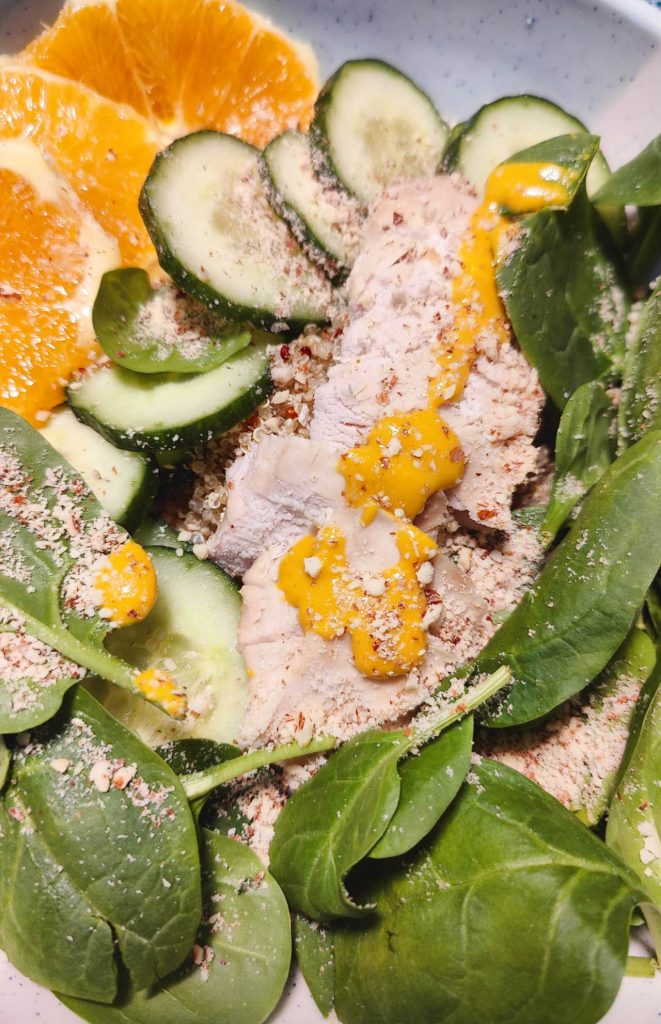 Place the quinoa on top of the vegetable and orange slices. Cut the cooked chicken breast into strips and place them on the quinoa. Squeeze some mustard on the chicken breast strips and sprinkle with a dash of ground almonds. Enjoy.