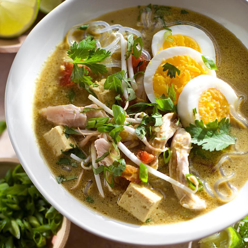 把切成⼩块的红萝⼘、蒜末、百⾥⾹、和腌制好的鸡胸⾁⼀起放到200ml沸⽔⾥煮10分钟,打⼊鸡蛋再煮3分钟。