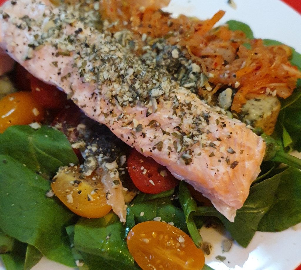 Place the spinach, cherry tomatoes, avocado and kimchi on the plate, then place the cooked salmon on top. Sprinkle with pumpkin seed, and parsley to enjoy.