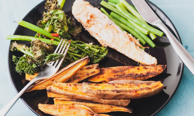 将切成条状的红薯、西葫芦、白萝卜芦笋放在烤盘上,撒上盐和胡椒。把腌制好的三文鱼从袋子取出,不要打开锡纸包,也放在烤盘上。一起放入烤箱12分钟。