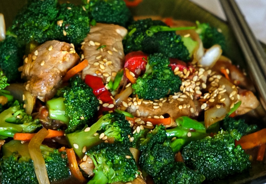 Heat the pan and add onion to cook for 2 minutes, then add the pork and cook for 5 minutes, then add the broccoli, cabbage, and pear to cook for a further 5 minutes.