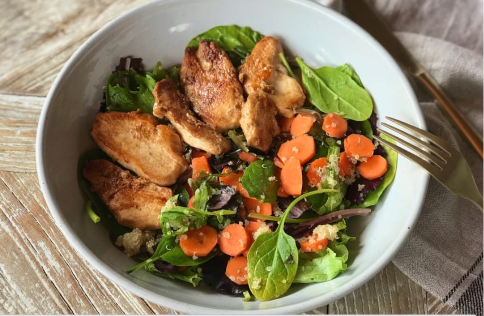Meanwhile, place the spinach, mixed fruit & veg, and quinoa on a plate, pour the salad dressing on top and mix well.